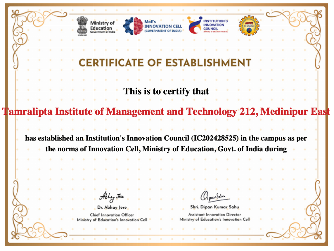 Tamralipta Institute of Management & Technology (TIMT) established the Institution’s Innovation Council (IIC: IC202428525) on its campus in accordance with the guidelines of the Innovation Cell, Ministry of Education (MoE), Government of India, during the academic year 2023–24.